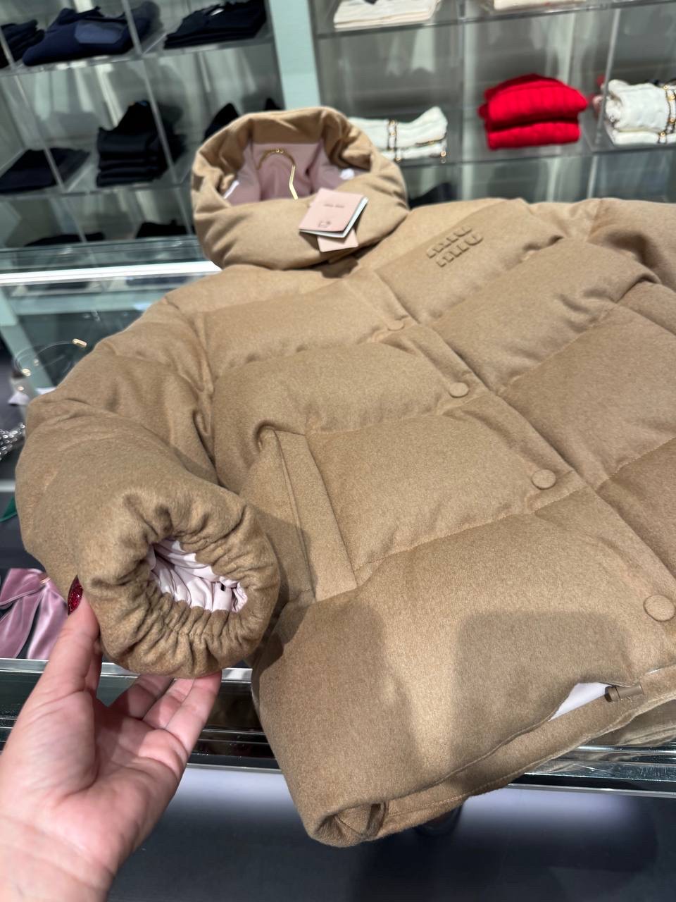This Miu Miu down jacket for women combines luxury with comfort, offering a stylish protection against the cold. The oversized silhouette and chic design make it a versatile addition to any wardrobe, perfect for both casual and upscale occasions.