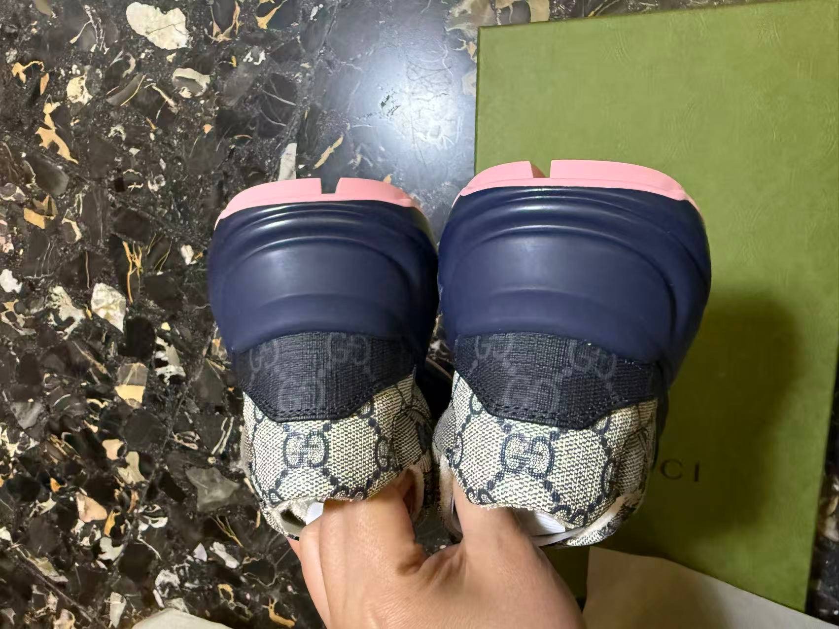 Discover the unique style of Gucci's Rhyton sneakers, expertly designed for women. These sneakers blend a luxurious aesthetic with comfort, featuring a distinctive navy and pink color palette that highlights the iconic Gucci monogram. Elevate your footwear collection with this statement piece that captures modern elegance.